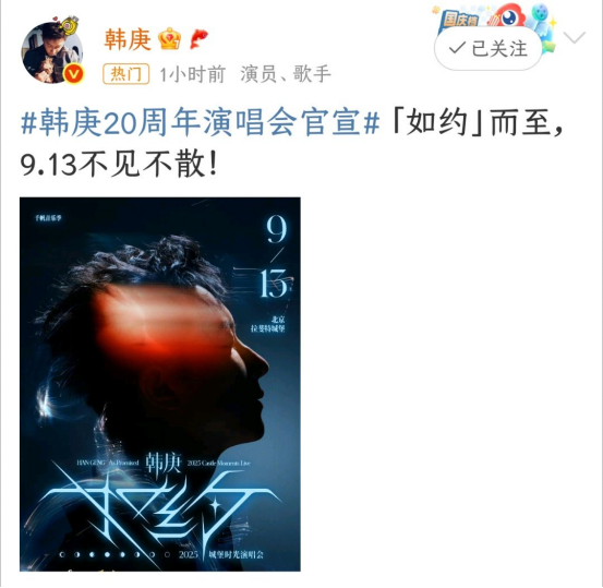就在今天,韩庚在社交平台写下短短十个字:“如约而至,9.13不见不散!”